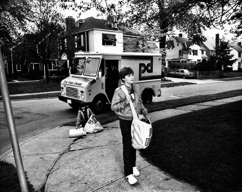 After Tommy got the alarm clock calmed down, got dressed, and got himself to the garage, he started inserting the front page and sports page sections into the Sunday edition of the Cleveland Plain Dealer. He had already gotten the comics and classifieds and the rest of the newspaper on Friday when his route manager tossed the bundles out the back of his truck onto their driveway. He put those parts together on Saturday afternoon, after which he went collecting payments.